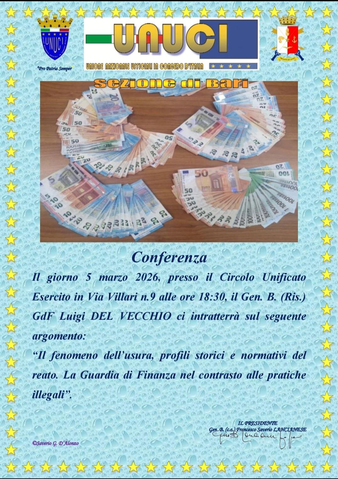 Giovedì 5 marzo, alle ore 18.30, presso il Circolo Unificato dell’Esercito di Bari, il Generale di Brigata della Guardia di Finanza in congedo Luigi Del Vecchio interverrà in un incontro pubblico dedicato al tema dell’usura, fenomeno criminale antico ma ancora oggi di drammatica attualità.