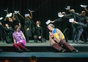 La messa in scena è stata senza dubbio molto particolare: l’utilizzo di proiezioni, luci ed effetti sonori ha creato un continuo dialogo visivo e sonoro con la musica. Sul lato sinistro del palco, un disegnatore realizzava dal vivo opere proiettate su un grande schermo di fondo – prevalentemente frasi e parole chiave in tedesco – mentre sulla destra una rumorista dal vivo produceva effetti sonori sincronizzati con l’azione scenica. Soluzioni originali e coinvolgenti, che hanno reso più immediata e accessibile la narrazione, facilitando la partecipazione emotiva del pubblico.