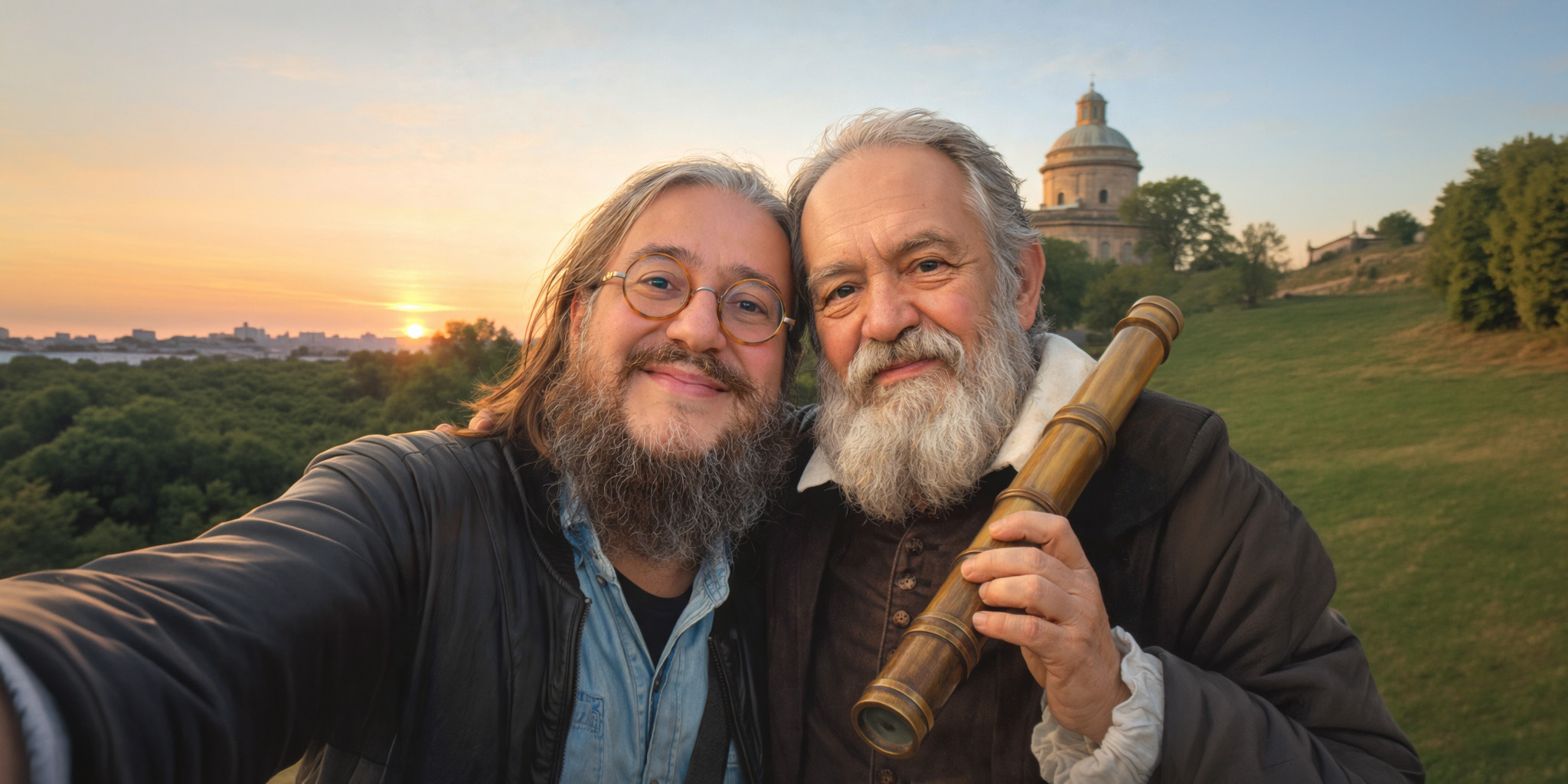 In copertina una elaborazione di fantasia dove immaginiamo Roberto Mercadini in compagnia di Galileo Galilei. Immagine realizzata tramite IA.