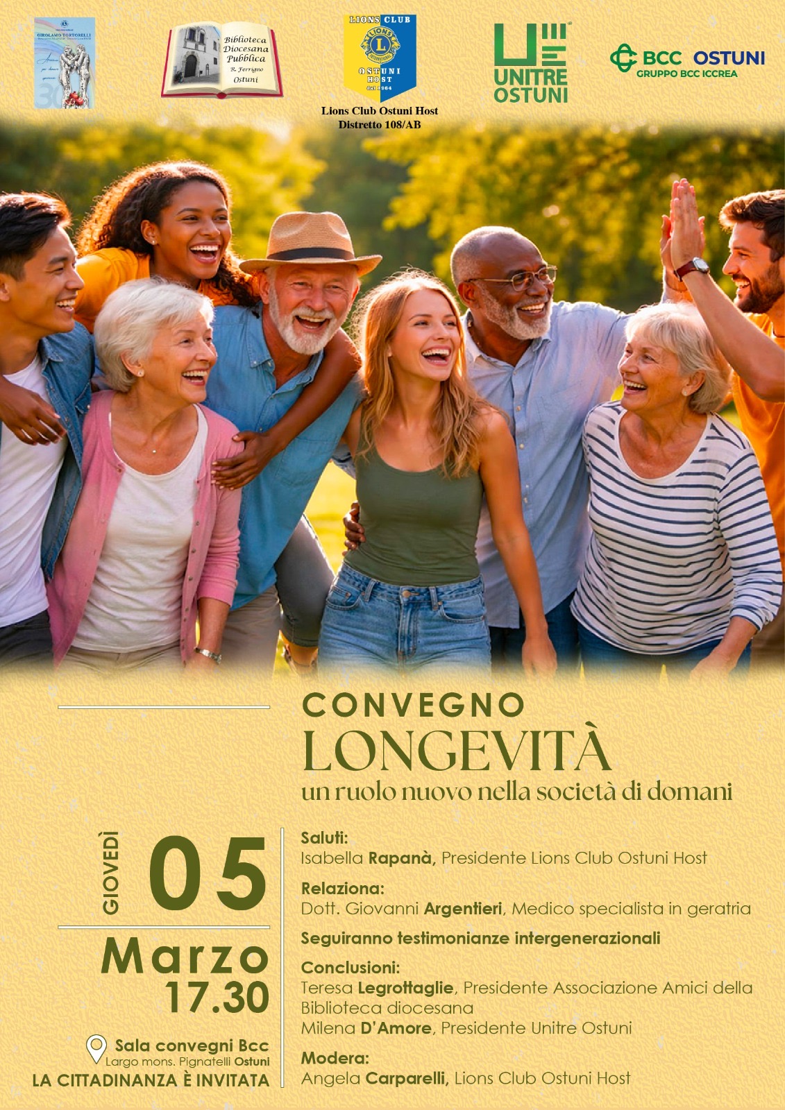 Si terrà giovedì 5 marzo 2026, alle ore 17.30, presso la Sala Convegni della Banca di Credito Cooperativo di Ostuni, il convegno dal titolo “Longevità – Un ruolo nuovo nella società di domani”, promosso dal Lions Club Ostuni Host in collaborazione con Unitre Ostuni.