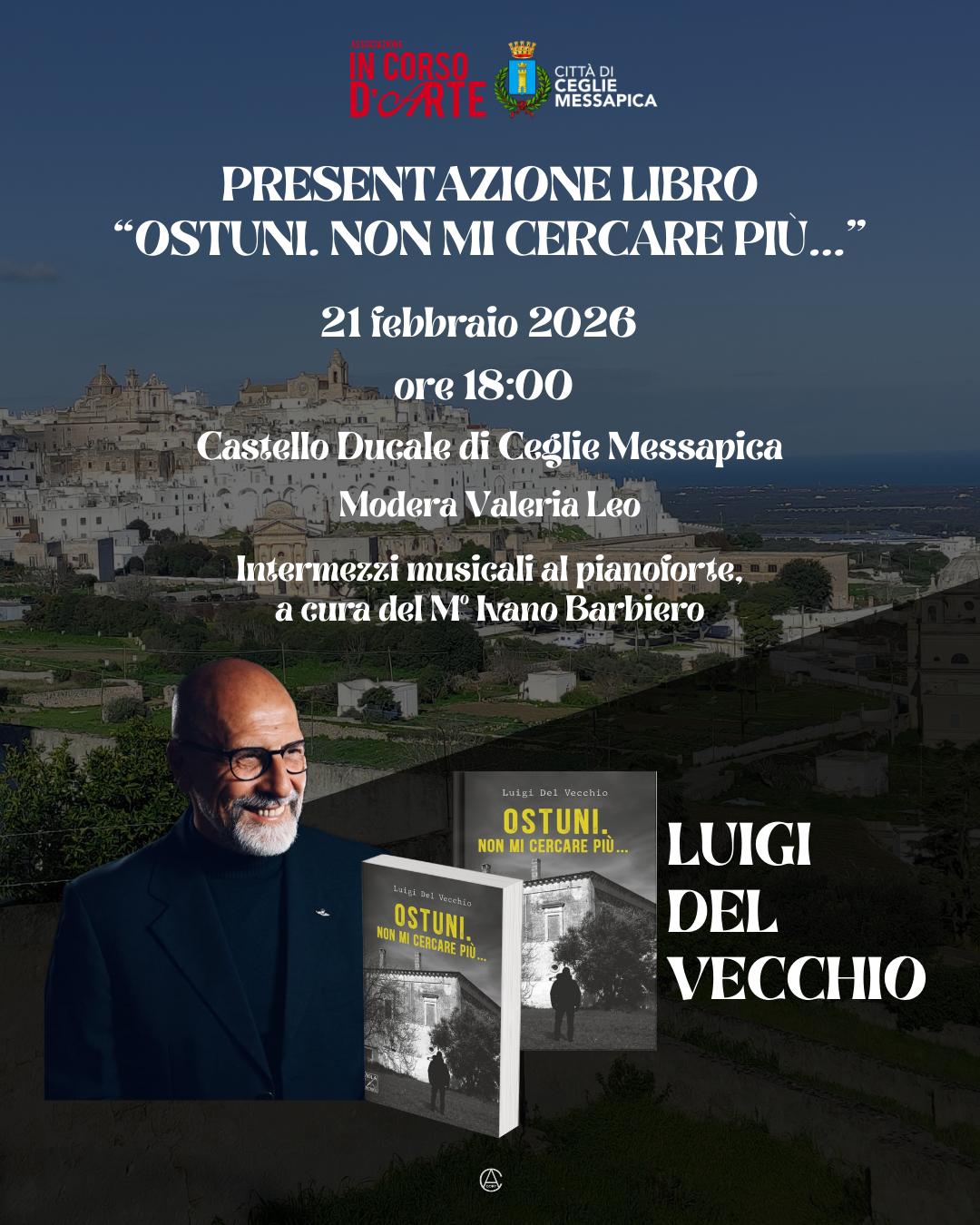 Sabato 21 febbraio, alle ore 18.00, nella suggestiva cornice del Castello Ducale di Ceglie Messapica, Luigi Del Vecchio presenterà il suo secondo thriller “Ostuni. Non mi cercare più…”, edito da Viola Editrice, riportando al centro dell’attenzione le indagini del Commissario Vito Berlingieri.