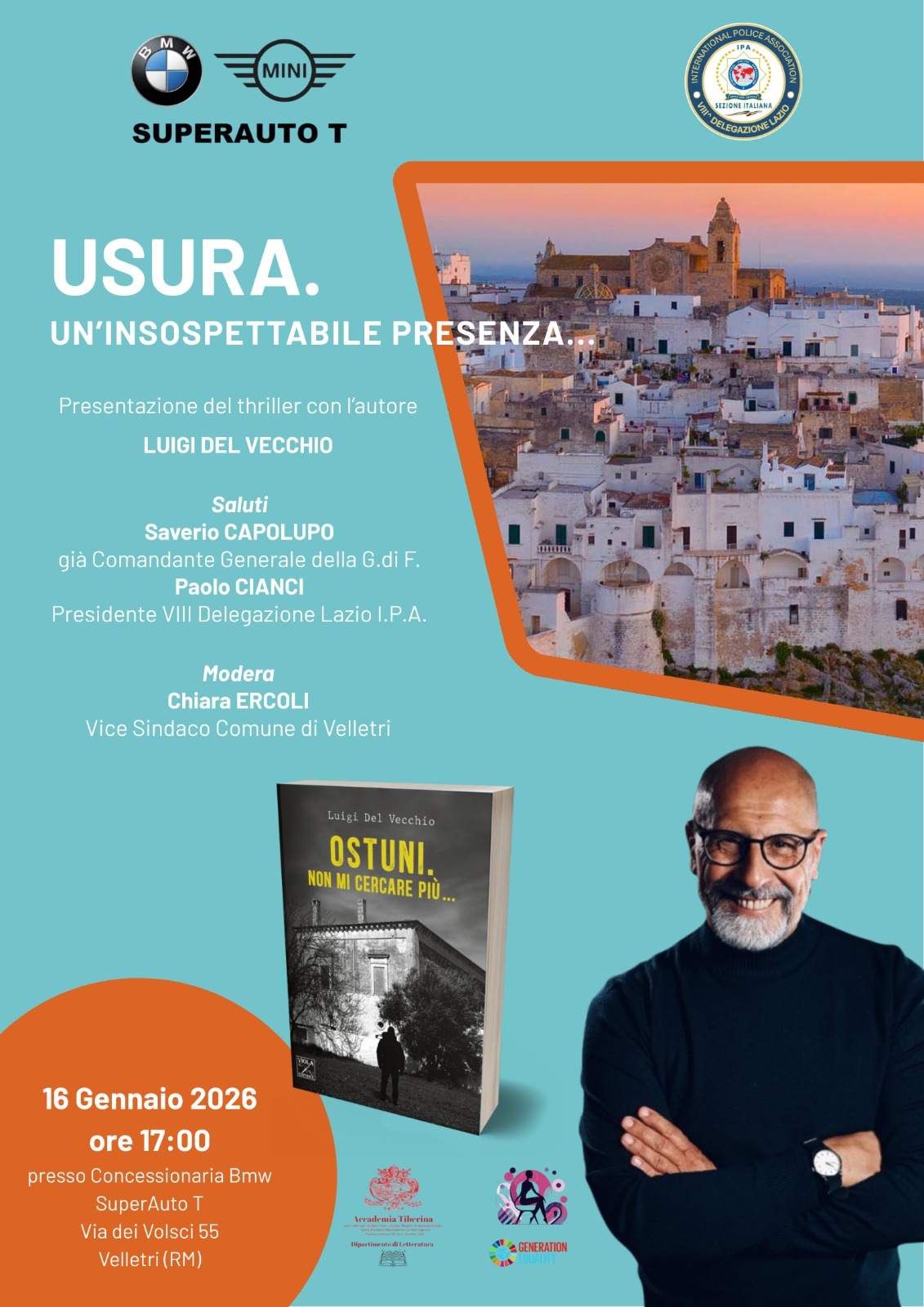 La presentazione del thriller Ostuni. Non mi cercare più… di Luigi Del Vecchio, in programma venerdì 16 gennaio 2026 a Velletri, si inserisce in un percorso culturale che utilizza la letteratura come strumento di riflessione civile. L’incontro, ospitato presso la Concessionaria BMW SuperAuto T, propone un dialogo che va oltre il racconto narrativo per affrontare il tema dell’usura e delle sue profonde conseguenze sociali ed economiche.