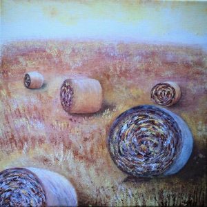 Tre dipinti in stile impressionista di Silvana Franco:“Giornata soleggiata” (Tempera su tela con spugna), “Covoni” (Tempera su tela con spugna), “Vento” (Tempera su tela)